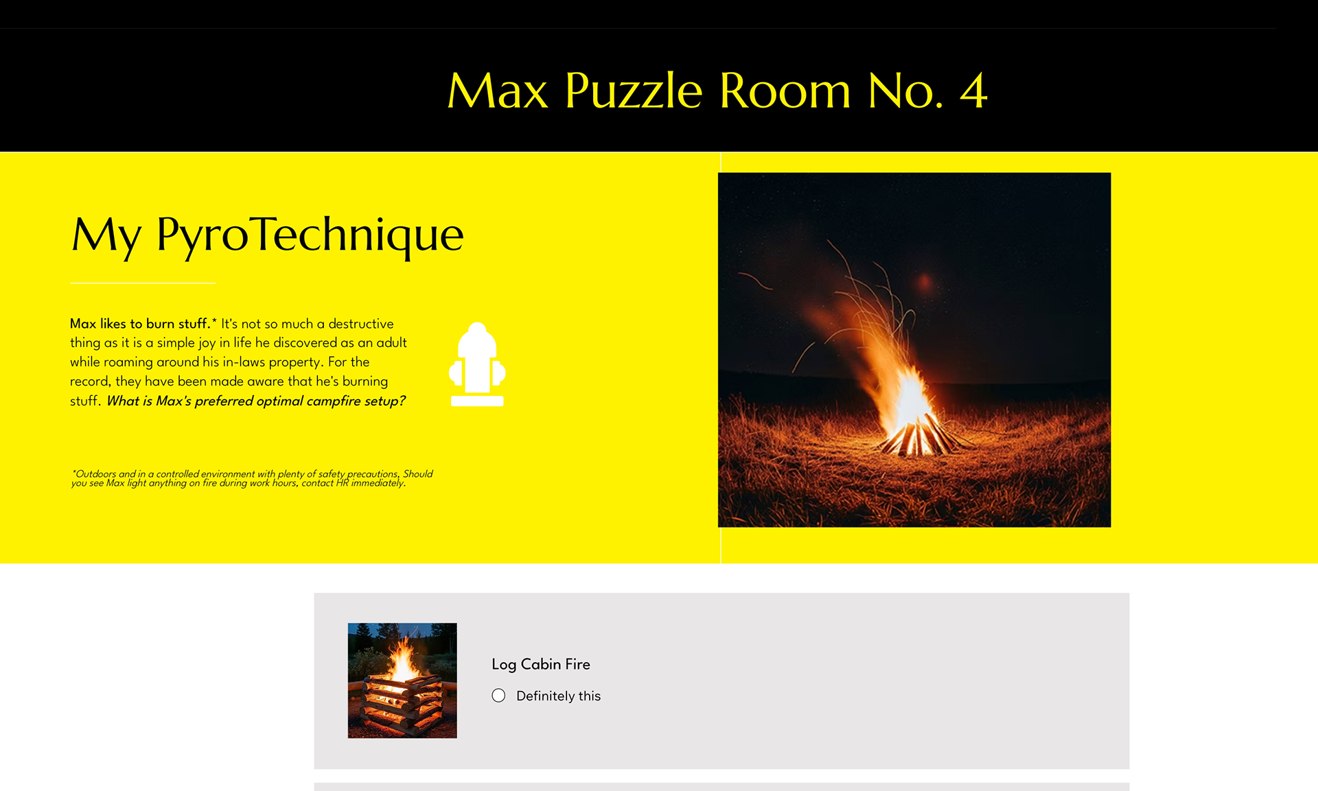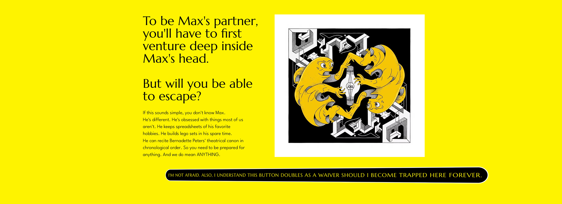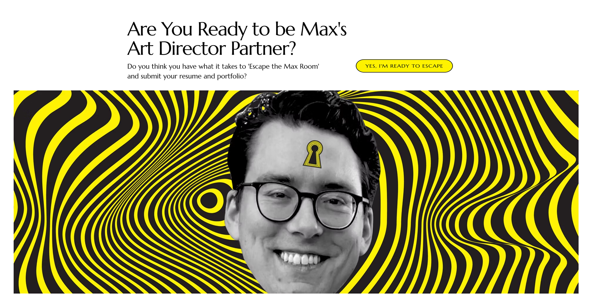 Max, one of my favorite copywriters, was recently in search of a brand new partner. To help him find not just any partner, but the PERFECT PARTNER, I created an 'Escape the Room' themed puzzle site where every puzzle was inspired by what's going on deep inside Max's brain. Those who managed to successfully escape were given the opportunity to submit their portfolio and resume to become Max's new partner. The press loved it. And Max found his creative soulmate.