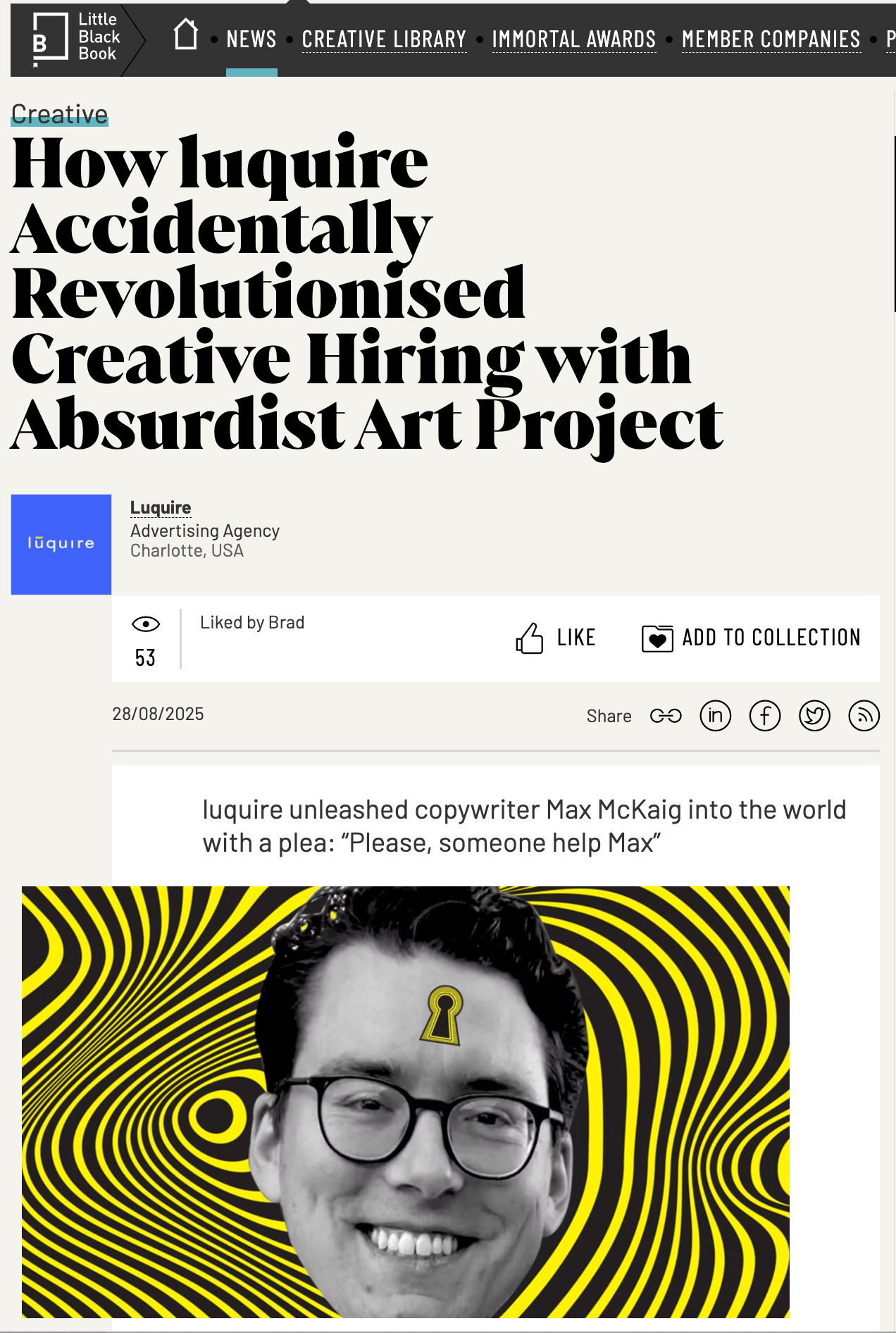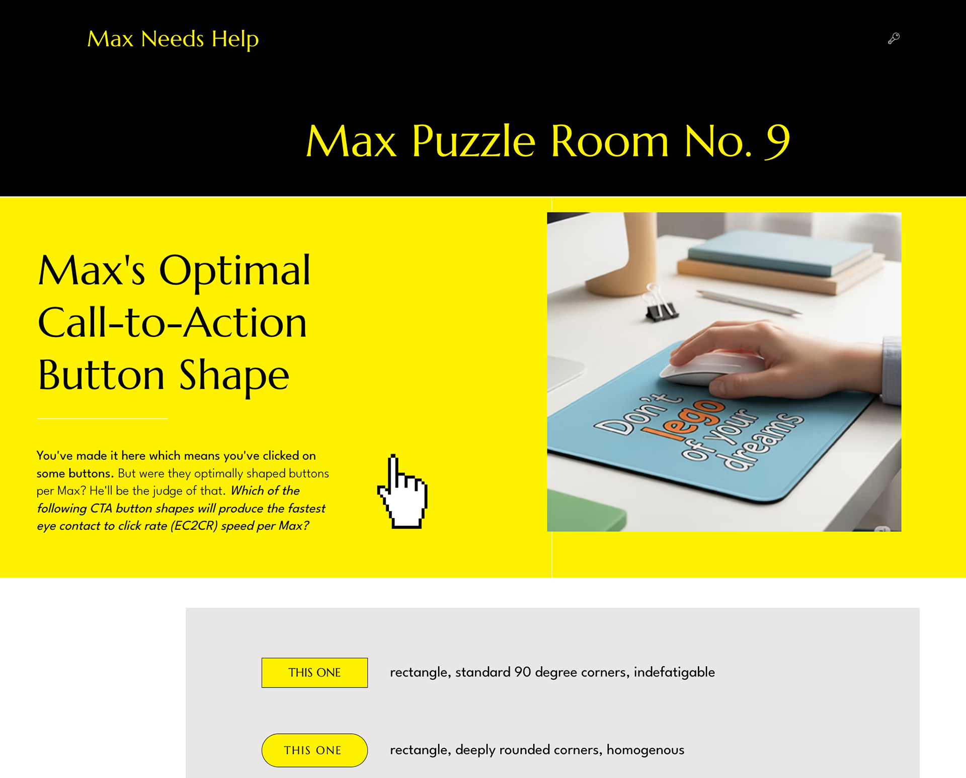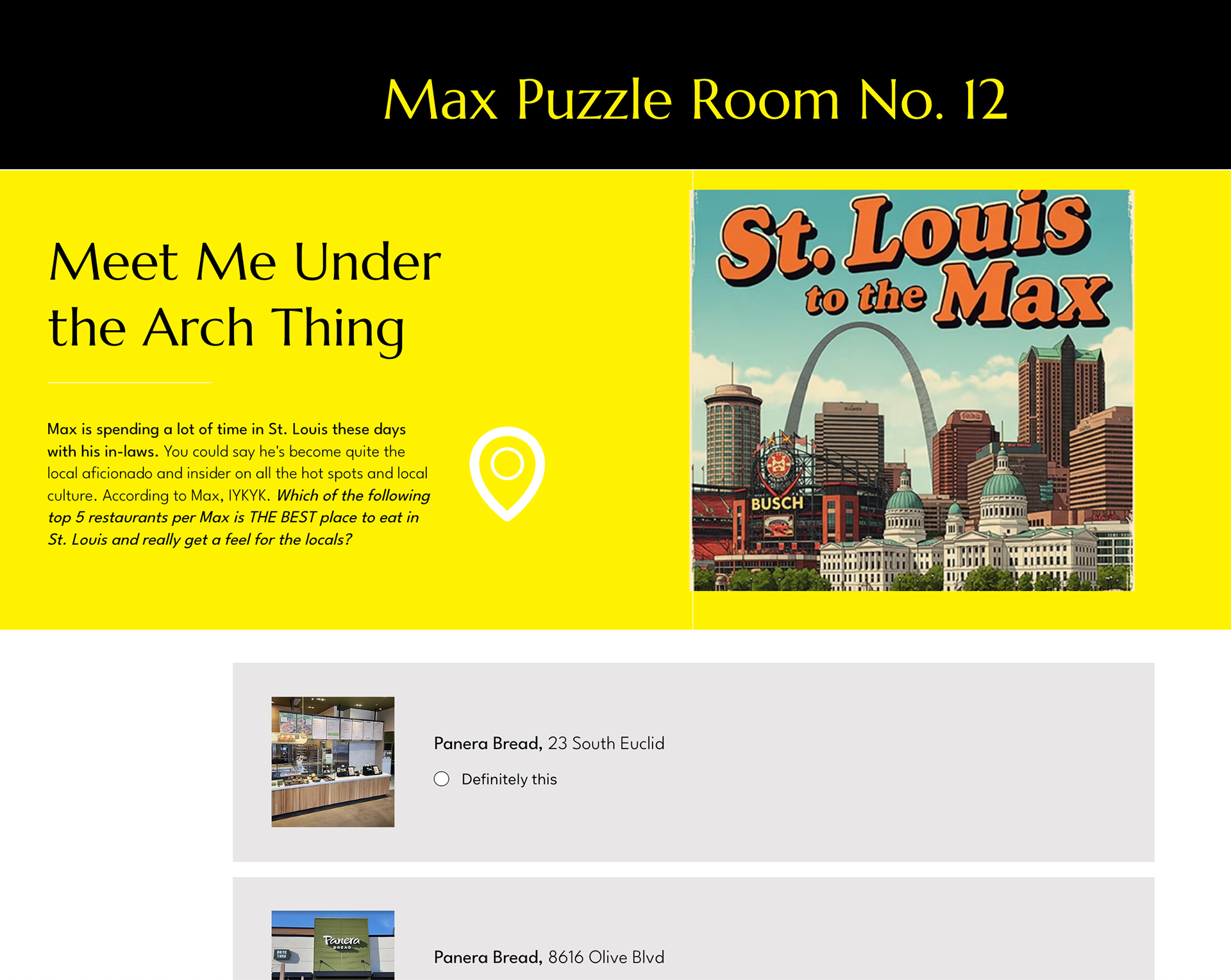 Max, one of my favorite copywriters, was recently in search of a brand new partner. To help him find not just any partner, but the PERFECT PARTNER, I created an 'Escape the Room' themed puzzle site where every puzzle was inspired by what's going on deep inside Max's brain. Those who managed to successfully escape were given the opportunity to submit their portfolio and resume to become Max's new partner. The press loved it. And Max found his creative soulmate.